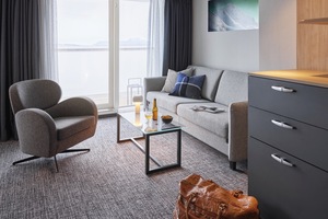 The captains view and a cozy corner on the ship's bow! This suite on deck 7 offers floor-to-ceiling windows wrapping around your private haven. From sunrise to starry skies, the corner mini suite surrounds you with light, space, and the feeling of being part of the scenery – without leaving your seat.